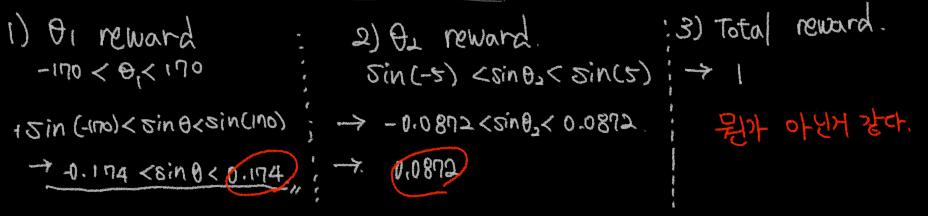 Total Reward 수식을 쓰려고 할 때 앞선 reward 페널티의 값들을 보고 이건 뭔가 아니다는 걸 느꼈다.